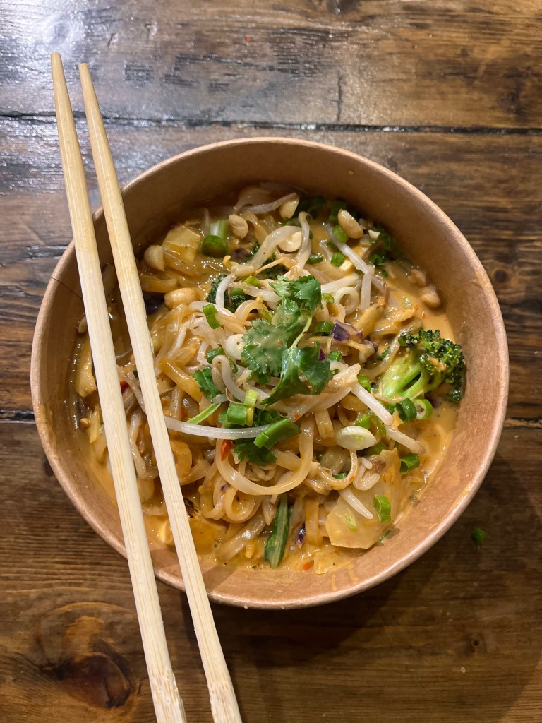 Gorgeous and delicious vegan Spicy Peanut rice-noodle bowl. The Noodle Box looks like a hole in the wall from the street, but is lively with it’s cozy and warm atmosphere. The husband got the Cambodian Mac and Cheese, and while it was not vegan, it is nice to find a place where we can both find something amazing to eat.