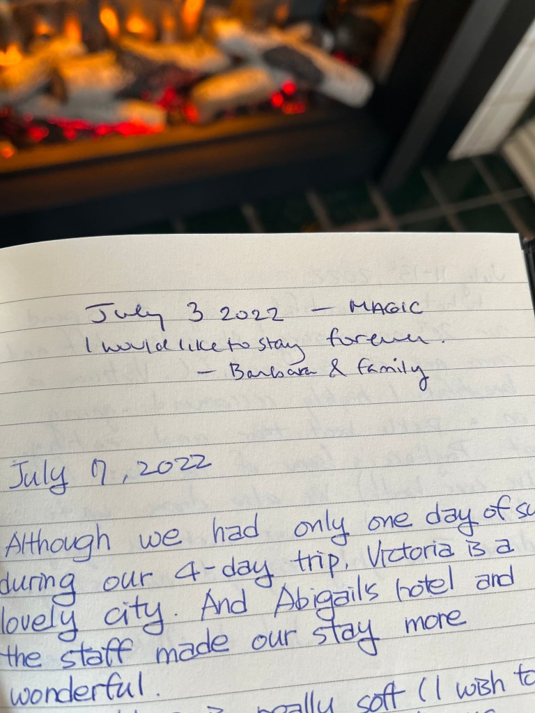 Atop the fireplace in the room was a notebook in which those who have stayed in room 1B wrote little blurbs about their stay and what brought them to Abigail’s in the first place.